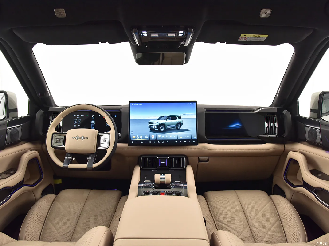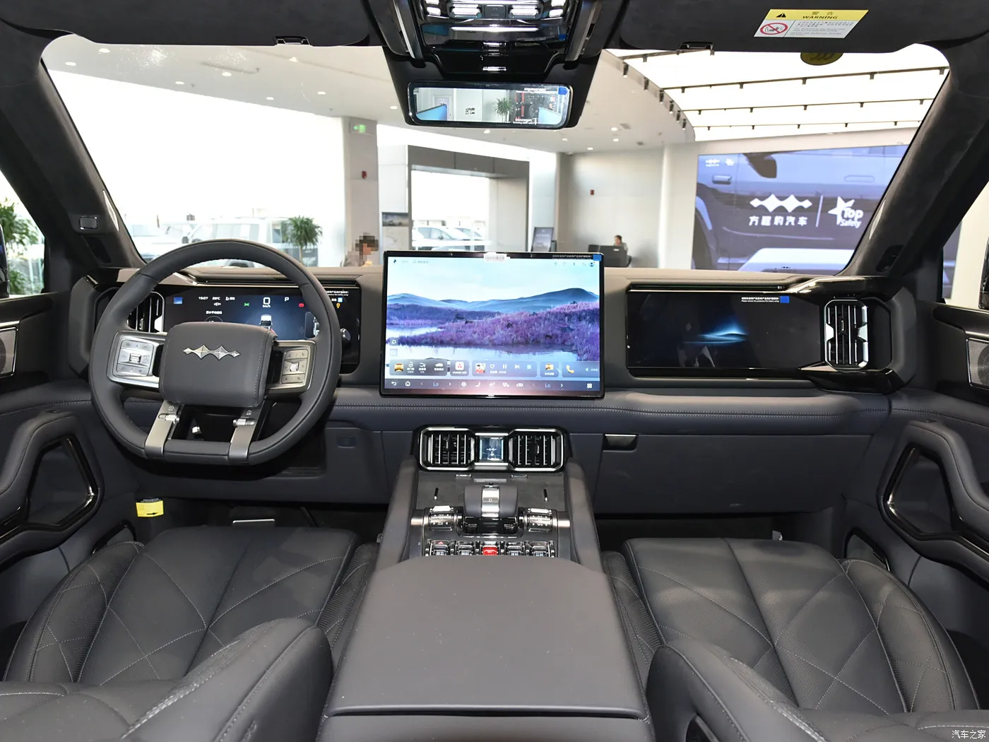 - Салон Leopard 8 выполнен в схожем квадратном стиле, как и у Leopard 5, но у флагманского внедорожника более роскошная отделка и сложные детали, такие как дверные подлокотники, оформленные в виде изогнутой восьмёрки. Центральный мультимедийный экран на трехэкранной передней панели больше, чем у Leopard 5. Во втором ряду Leopard 8 можно установить как традиционный трехместный диван, так и два отдельных капитанских кресла с высоким уровнем комфорта и множеством настроек. Галёрка рассчитана на двоих. Над лобовым стеклом расположены лидар и радары, что позволяет ожидать наличие у Leopard 8 продвинутого комплекса электронных помощников для водителя, включая системы для бездорожья.