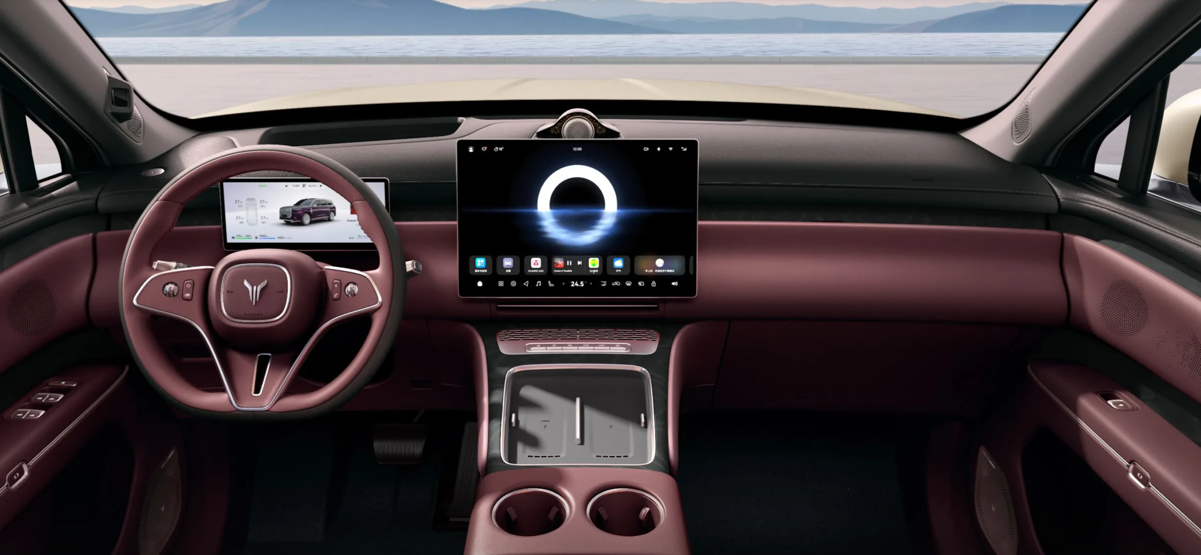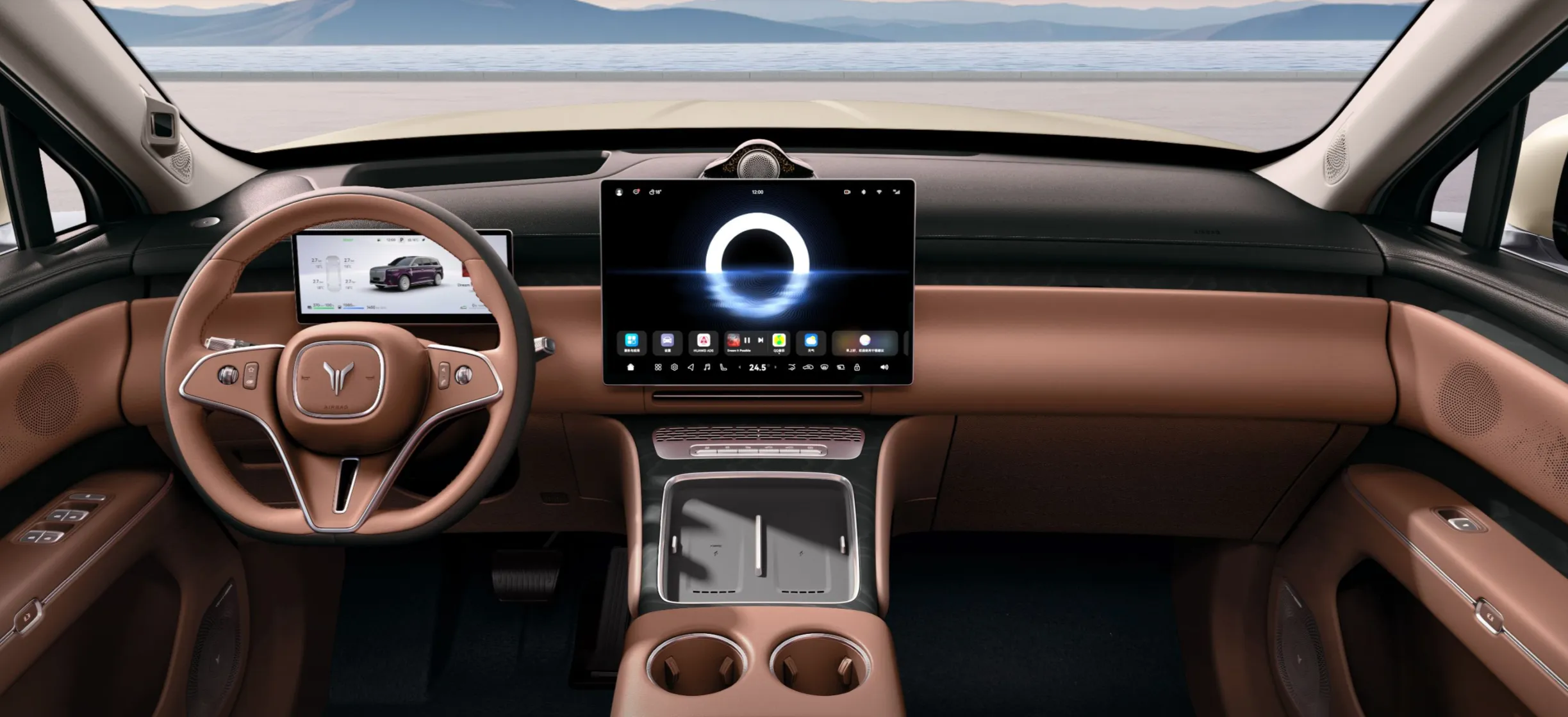 Центральный 16,5-дюймовый экран интегрирован в торпедо и работает под управлением системы HarmonyOS от Huawei (с голосовым ассистентом). Панорамная крыша расширяет пространство, делая салон более светлым и воздушным. Ультразвуковые датчики предотвращают случайный контакт при открывании дверей.