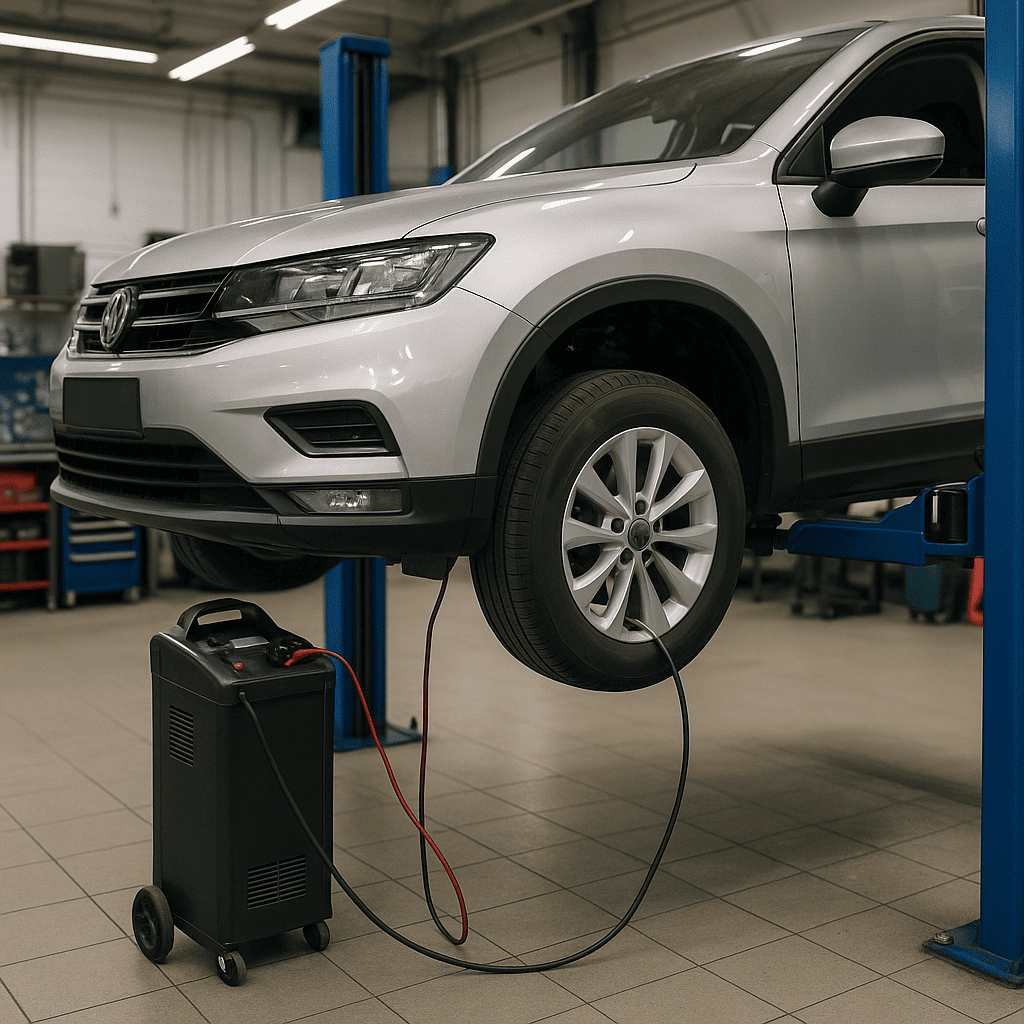 Автомобиль устанавливается на ровную площадку, колеса выставляются строго прямо. Это критически важное условие для точности калибровки. Подключается зарядное устройство к аккумулятору, чтобы избежать скачков напряжения или его отключения во время программной настройки, что могло бы нарушить процесс.