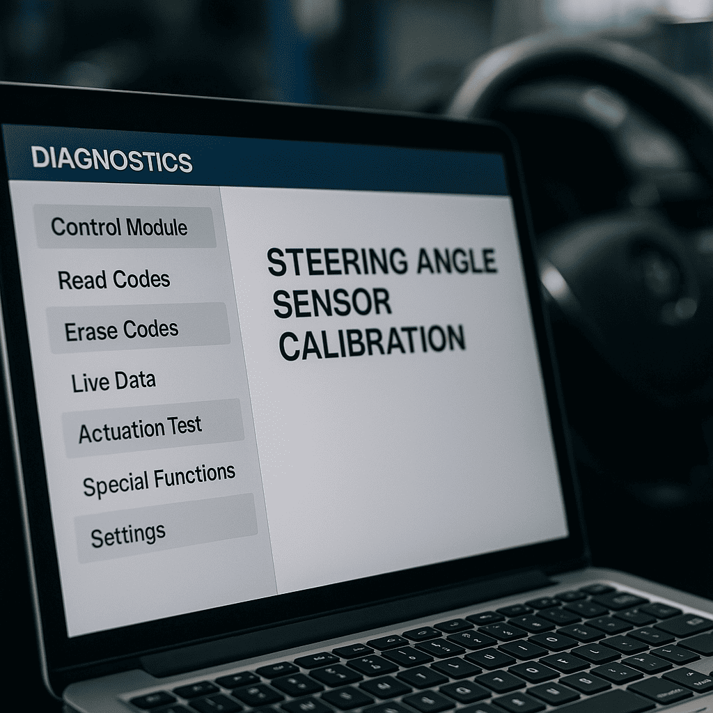 Через диагностическое ПО мастер вручную запускает сервисную функцию калибровки рулевого управления. На этом этапе электронный «мозг» автомобиля переводится в режим обучения, ожидая новые данные о нулевом (прямом) положении рулевой рейки и колес. Панель приборов может сигнализировать о временной неисправности — это нормально.