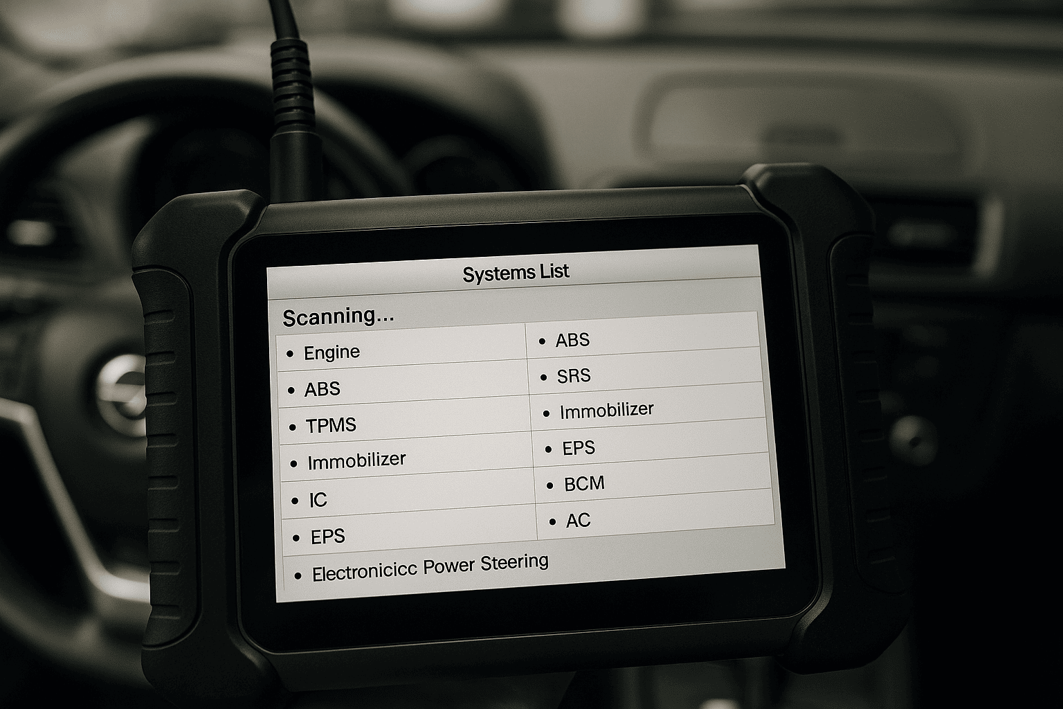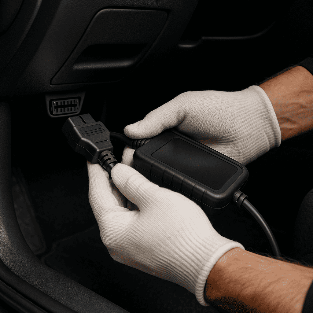 Мы подключаем профессиональный диагностический сканер к разъему OBD-II вашего автомобиля. Это не просто «считывание ошибок» — это установка связи со всеми электронными блоками управления (ЭБУ). Сканер «знакомится» с системами двигателя, трансмиссии, ABS, ESP и другими, получая полный доступ к их скрытым данным и журналам событий, чтобы ничего не упустить.