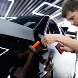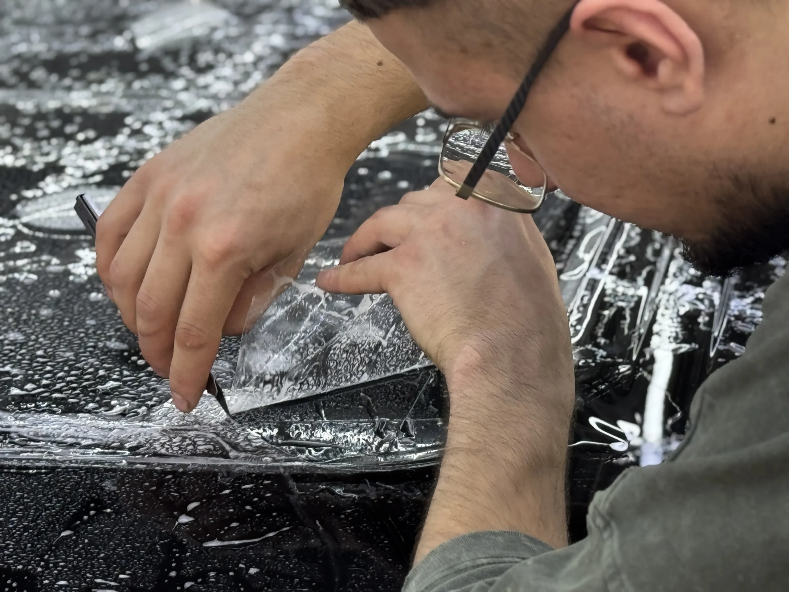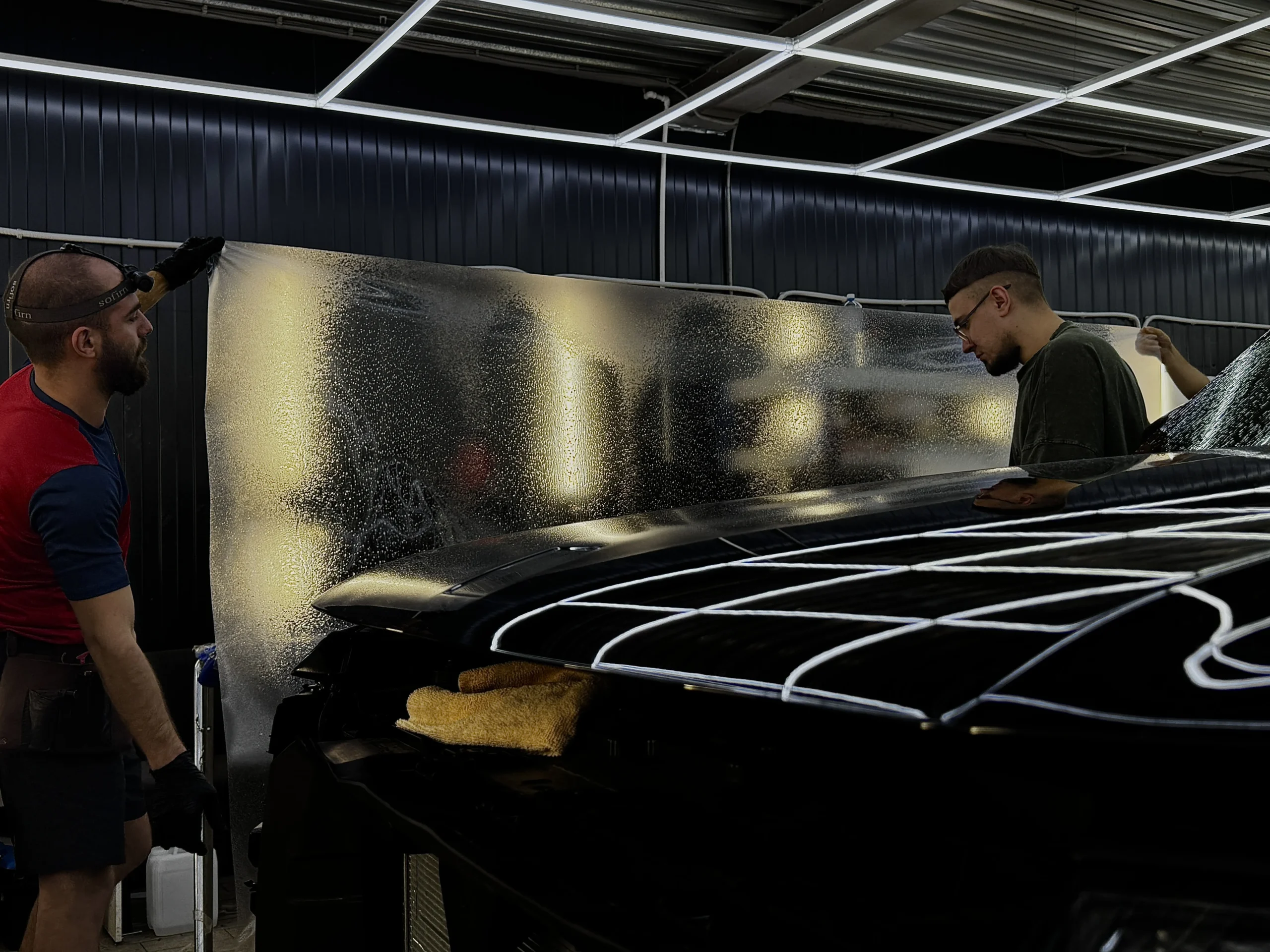Для каждого элемента кузова пленка предварительно режется и подгоняется. Это требует высокой точности и внимания к деталям, чтобы покрытие было равномерным и без изъянов.
