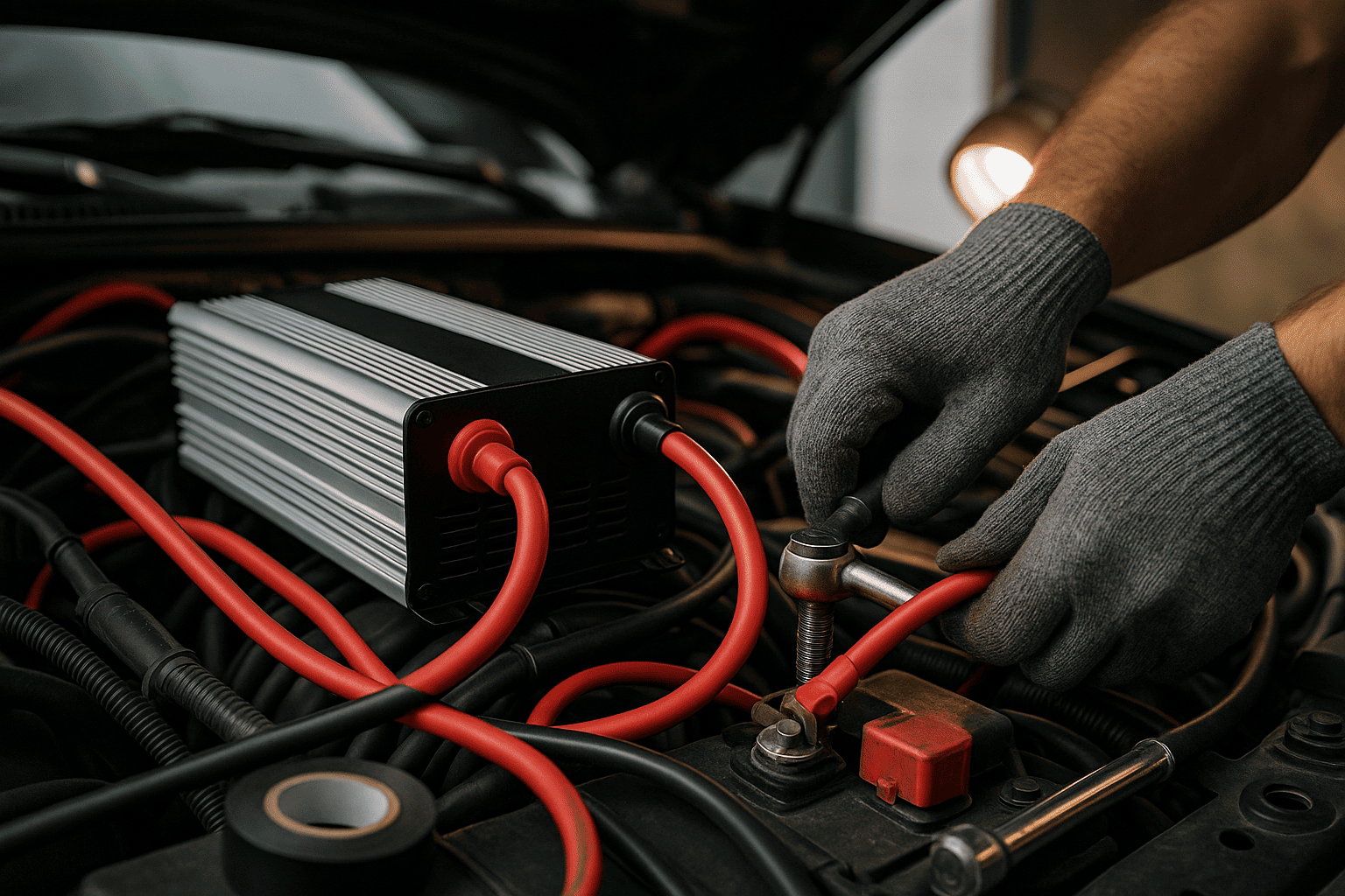 На этом этапе инвертор аккуратно интегрируется в электроцепь автомобиля в соответствии с техническим регламентом. Мастер обеспечивает надежное соединение клемм, правильную прокладку кабелей через технологические отверстия и их защиту от перетирания и нагрева. Все работы ведутся с соблюдением мер безопасности для исключения короткого замыкания.