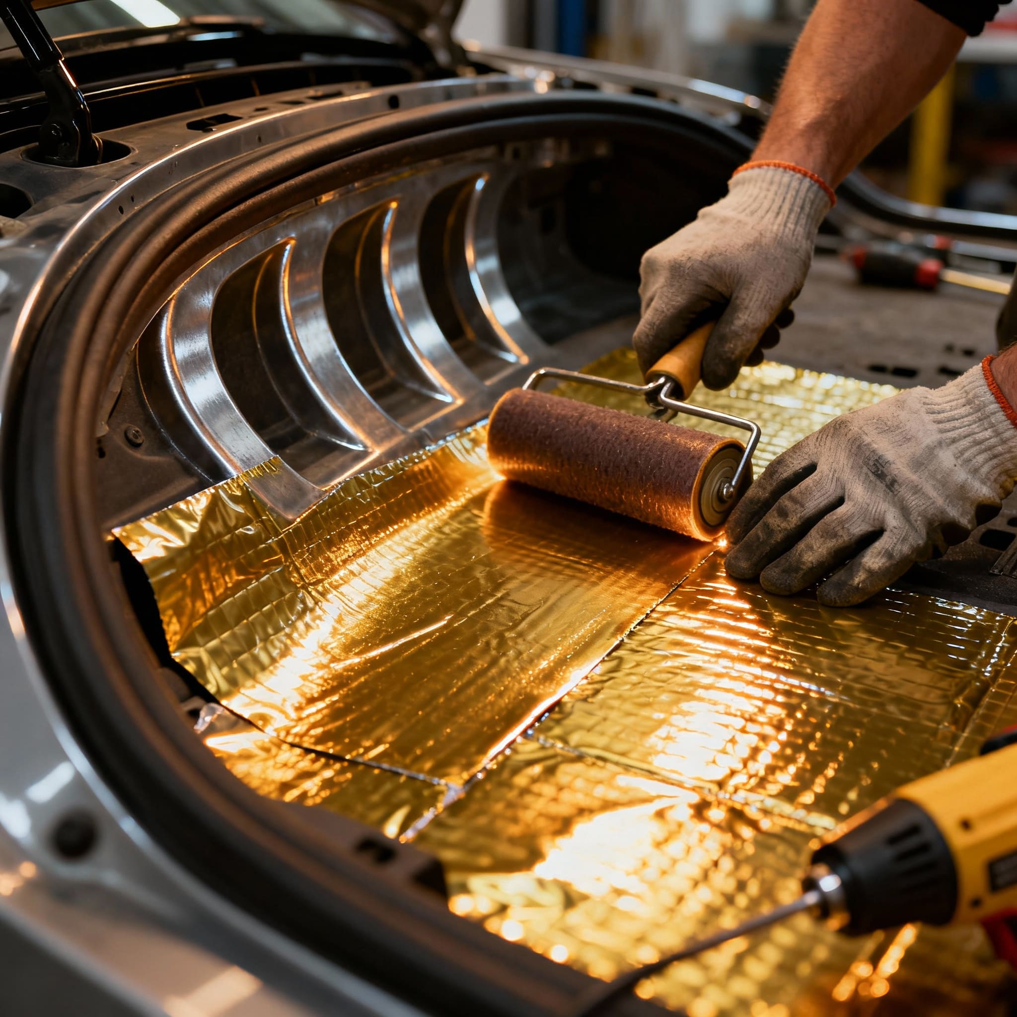 Первый, вибропоглощающий слой, наносится на чистый металл. Мы прогреваем материал строительным феном для увеличения пластичности и тщательно прокатываем его специальным роликом. Это позволяет надежно прикатать материал ко всем изгибам и рельефу арки, выдавливая воздух и обеспечивая максимальный контакт с поверхностью для гашения вибраций.