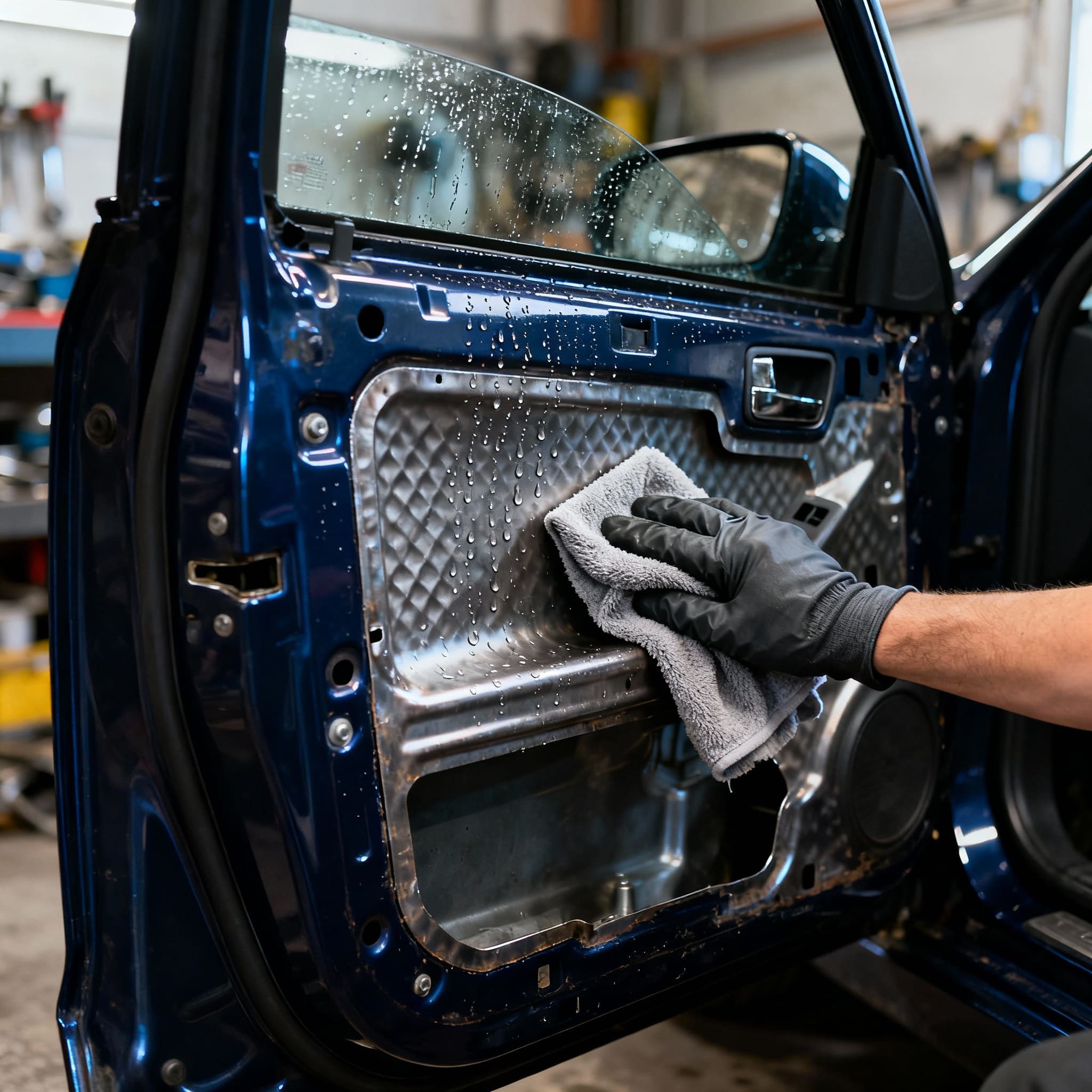 Двери автомобиля тщательно очищаются от пыли, грязи и других загрязнений. Это необходимо для обеспечения максимального сцепления шумоизоляционного материала с поверхностью дверей.