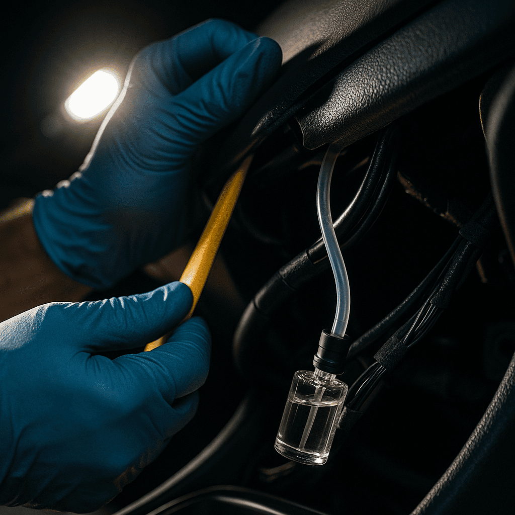 Специалист аккуратно подводит миниатюрные трубки аромастанции к вентиляционным каналам системы климат-контроля. Все работы ведутся с использованием пластиковых инструментов, чтобы исключить малейшие царапины на панелях. Модуль надежно фиксируется, а проводка аккуратно укладывается вдоль штатных жгутов.