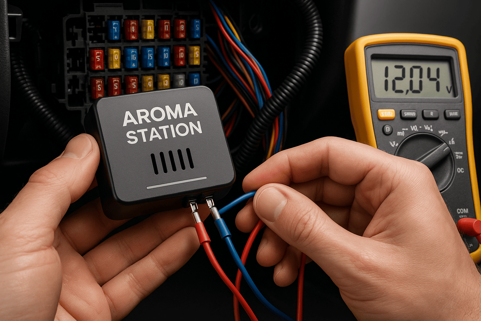 Электронный блок аромадиффузора подключается к бортовой сети через разъем прикуривателя или напрямую через предохранители. Мастер настраивает интенсивность подачи аромата и проверяет равномерность распределения ароматического облака по всему салону.