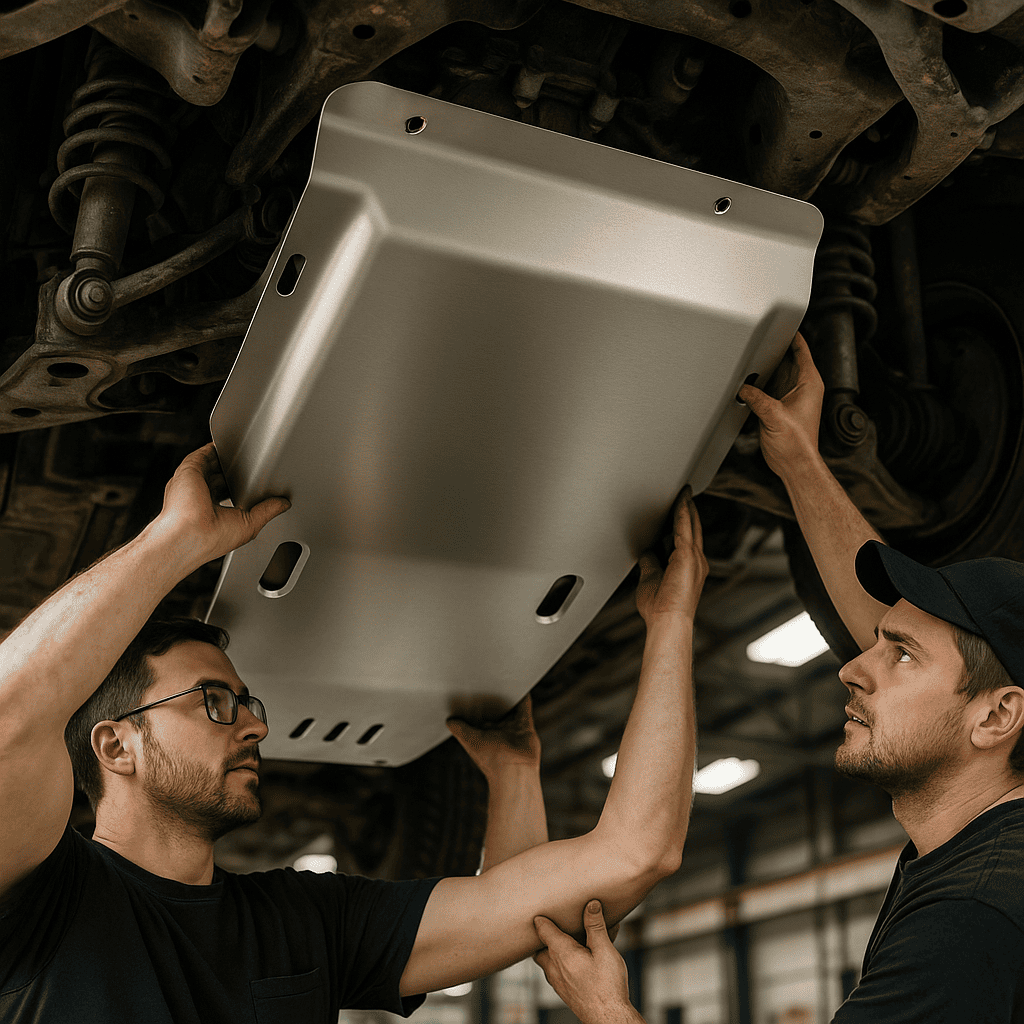 Новая защита аккуратно устанавливается на штатные крепежные точки без окончательной затяжки. Мы проверяем точность посадки, зазоры относительно кузова и выхлопной системы. При необходимости выполняем точную подгонку, чтобы исключить любой контакт с кузовом, который может привести к появлению шумов при движении по бездорожью или неровностям.
