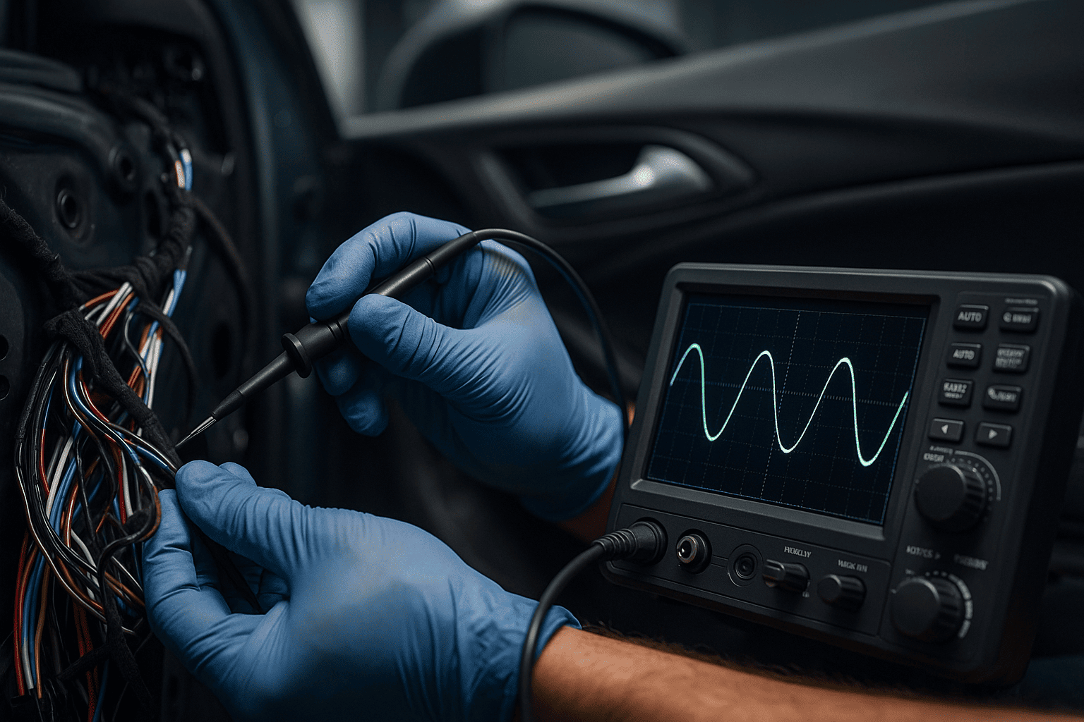 Подключаем диагностическое оборудование к штатной магнитоле и с помощью осциллографа искажаем звуковой сигнал. Это позволяет точно определить участок системы, где происходит потеря мощности или возникают помехи: провода, усилитель, сами динамики. Мы не гадаем, а находим точную причину, будь то перебитый кабель в дверном жгуте или окислившиеся контакты.