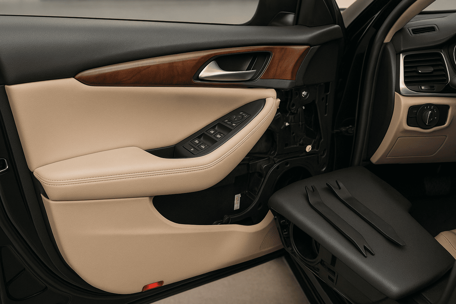 Аккуратно, с помощью специализированного инструмента снимаем обшивку салона и дверей, чтобы получить доступ к акустической системе. Это ювелирная работа, требующая опыта, чтобы не оставить царапин и сколов на пластике. Мы извлекаем проблемные динамики, проверяем целостность проводки на всем пути и подготавливаем посадочные места для новых динамиков.