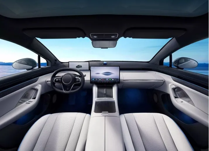 Габариты автомобиля составляют 4971×1963×1474 мм при колесной базе 2950 мм, что соответствует полноразмерному седану. Внешность выполнена в стилистике OneBox: кузов с интегрированными элементами и плавными золотистыми изгибами создаёт поистине элегантный силуэт. Впереди авто — узкие фары, соединённые светодиодной полосой, а на крыше установлен лидар для систем автономного вождения.