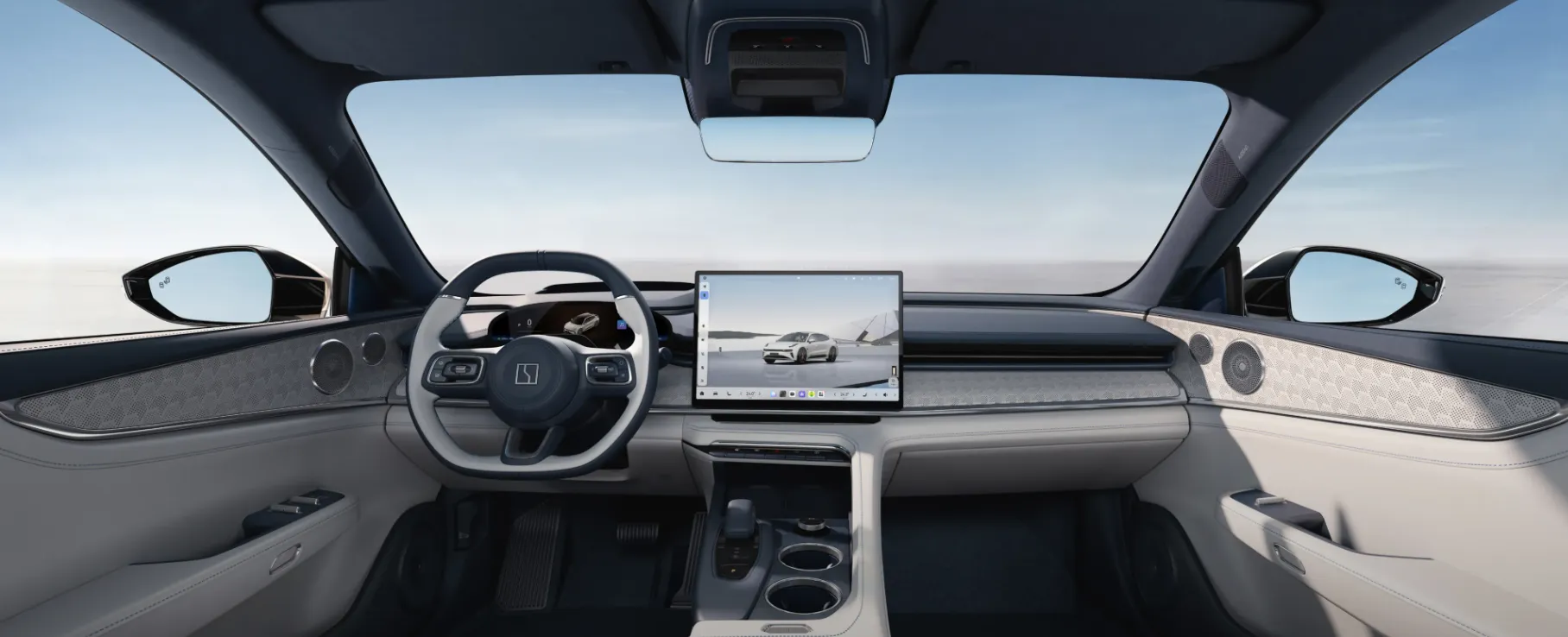В отделке интерьера использованы только высококачественные материалы: кожа Nappa, алькантара на потолке и центральной консоли, карбоновые вставки. Доступные цветовые схемы — белая, мятно-зеленая, коричневая и синяя с контрастной строчкой. Центральное место занимает 16-дюймовый сенсорный экран с разрешением 3,5K, который может поворачиваться на 30 градусов (работает на процессоре Snapdragon 8295). 13-дюймовая цифровая панель дополняется проекционным дисплеем AR (39,3 дюйма). Для задних пассажиров предусмотрен отдельный 8-дюймовый экран управления.